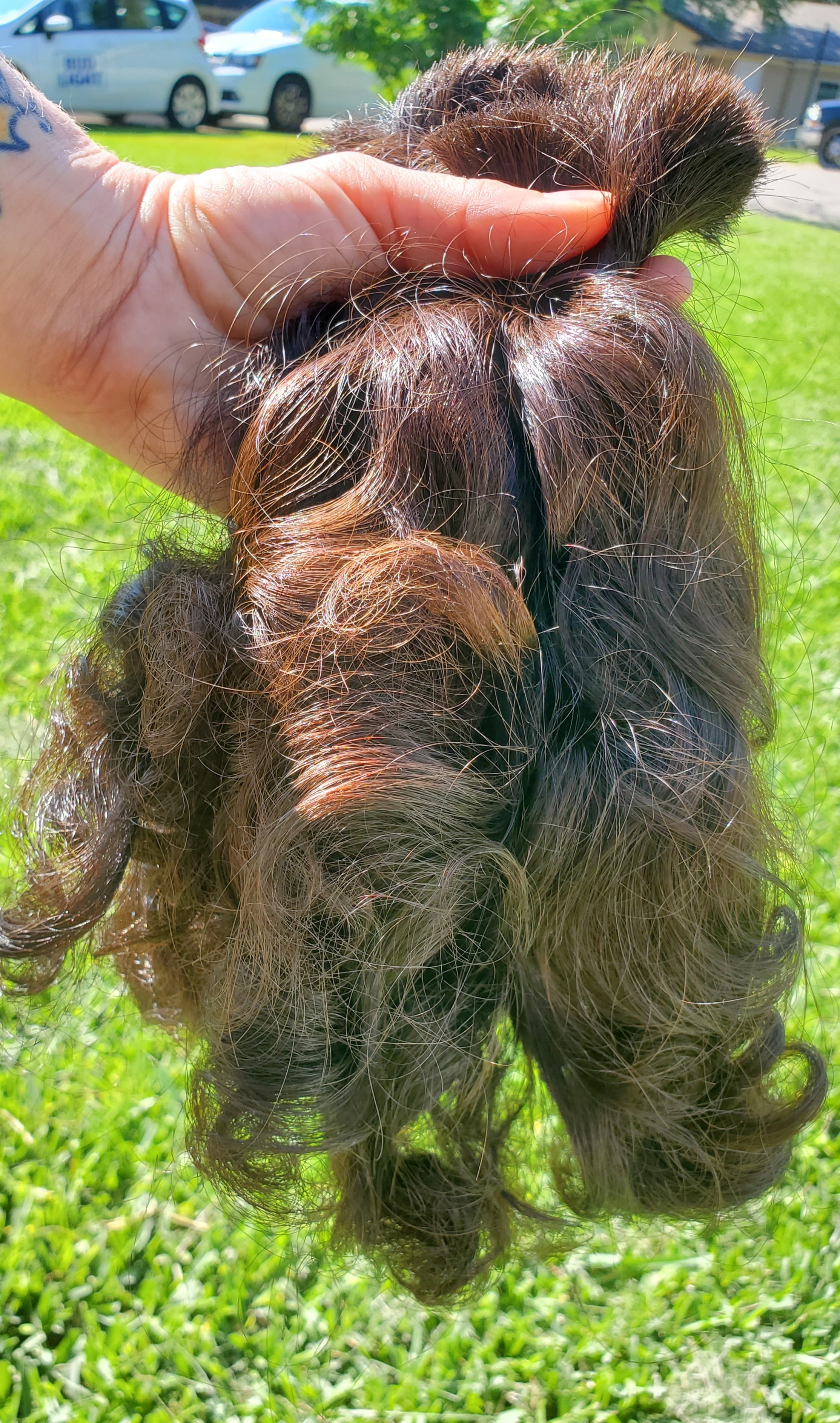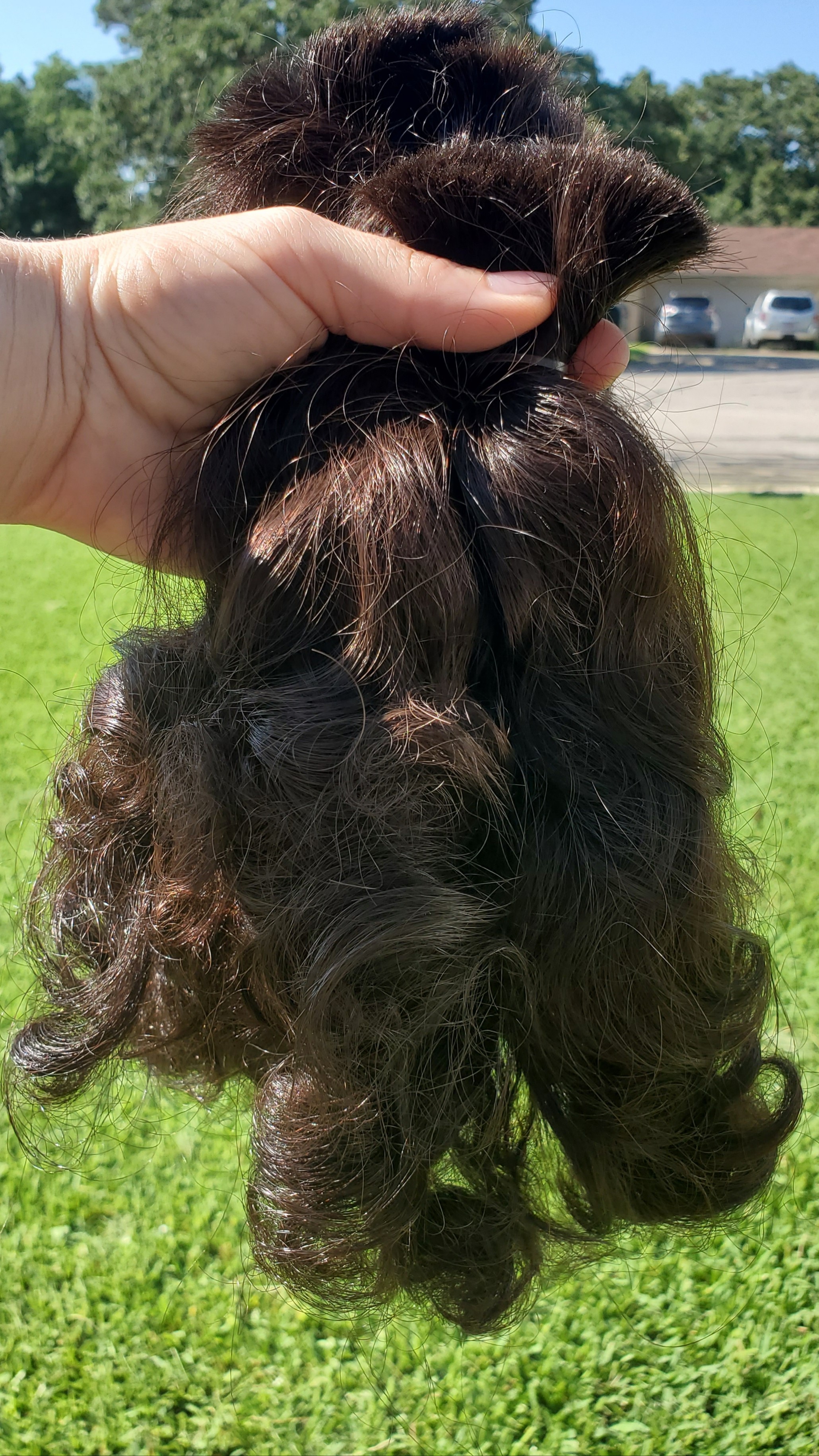 9 inches of soft, healthy, untreated, undyed, never heat styled Native American/Hispanic male curly brown hair. Hair shampooed